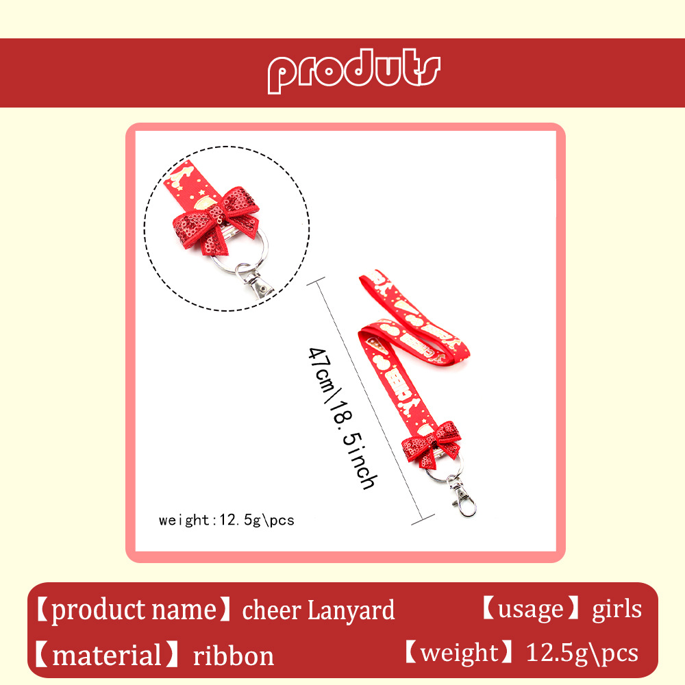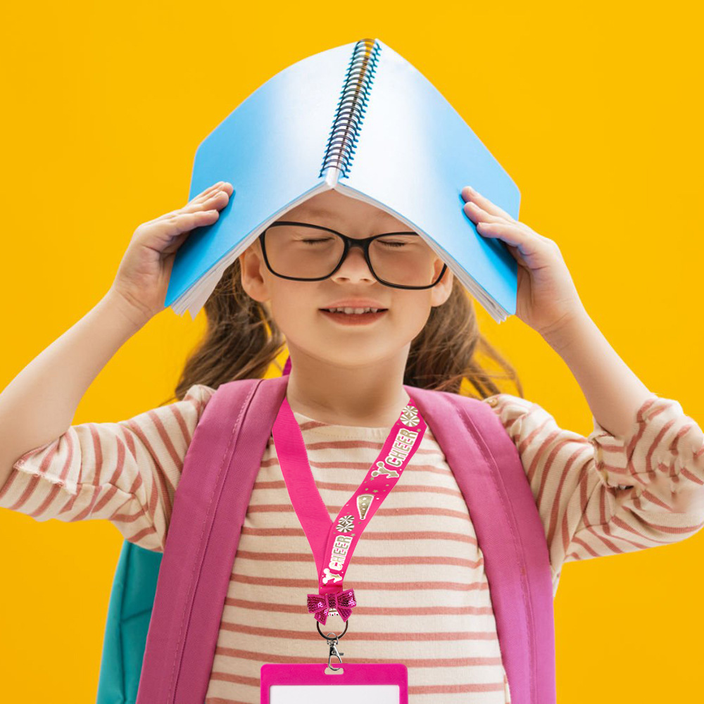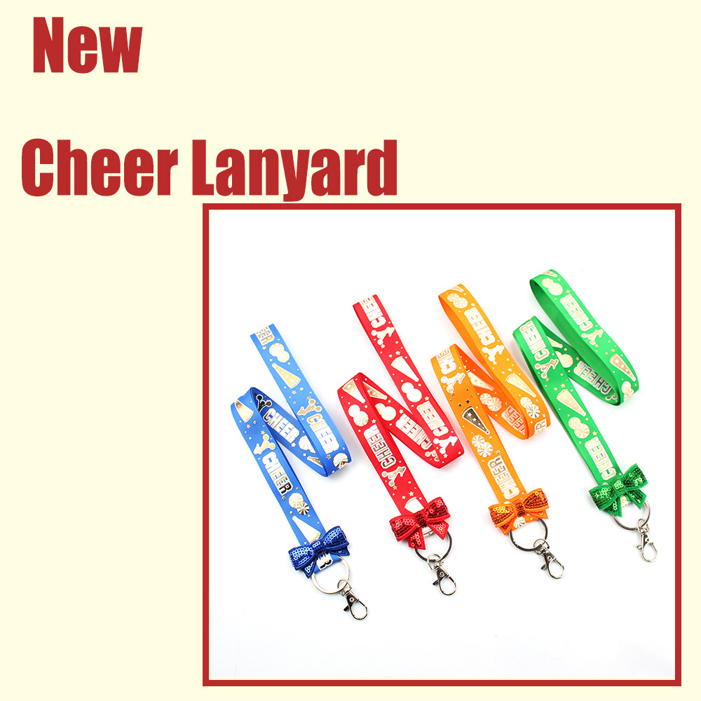 Vibrant Cheer Lanyards designed for coaches, students, and event organizers. Perfect for holding IDs, keys, and badges, these lightweight and durable lanyards feature colorful designs with a fun bow accent, adding energy and style to any occasion!